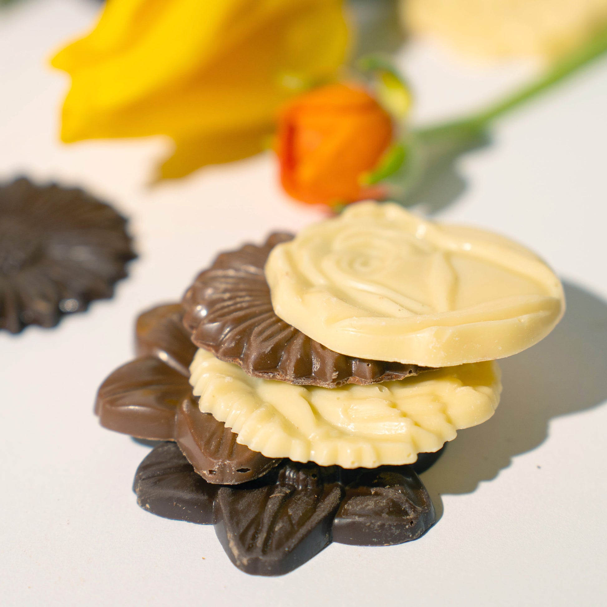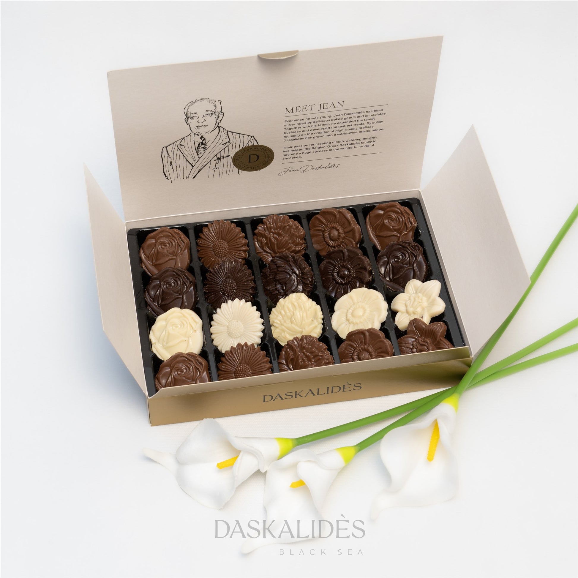 Фина селекция от шоколадови цветя Даскалидес от черен млечен и бял шоколад : красиви, елегантни и неустоимо вкусни. Всяко шоколадово цвете впечатлява с фина форма, детайлен релеф и нежен, балансиран вкус. Стилната бонбониера в златисто-бронзов отенък допълва с елегантност красотата на шоколадовата композиция и я превръща в перфектен подарък за всеки специален повод.