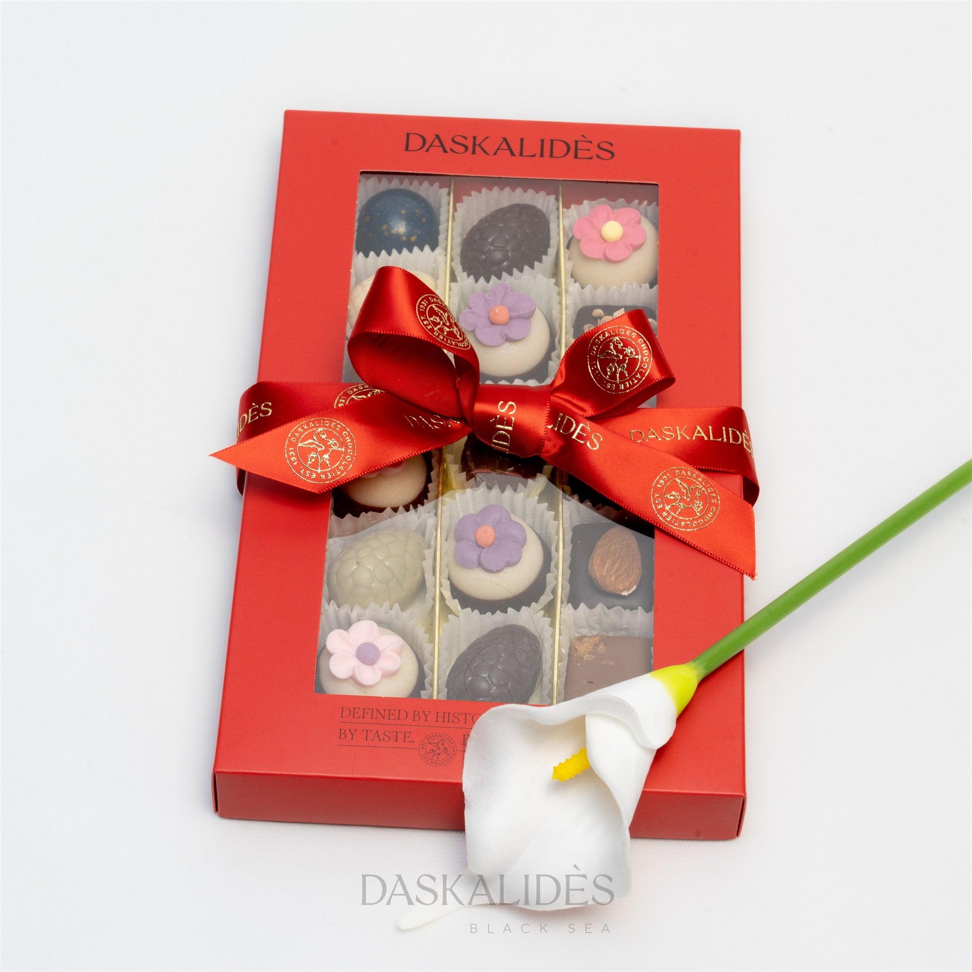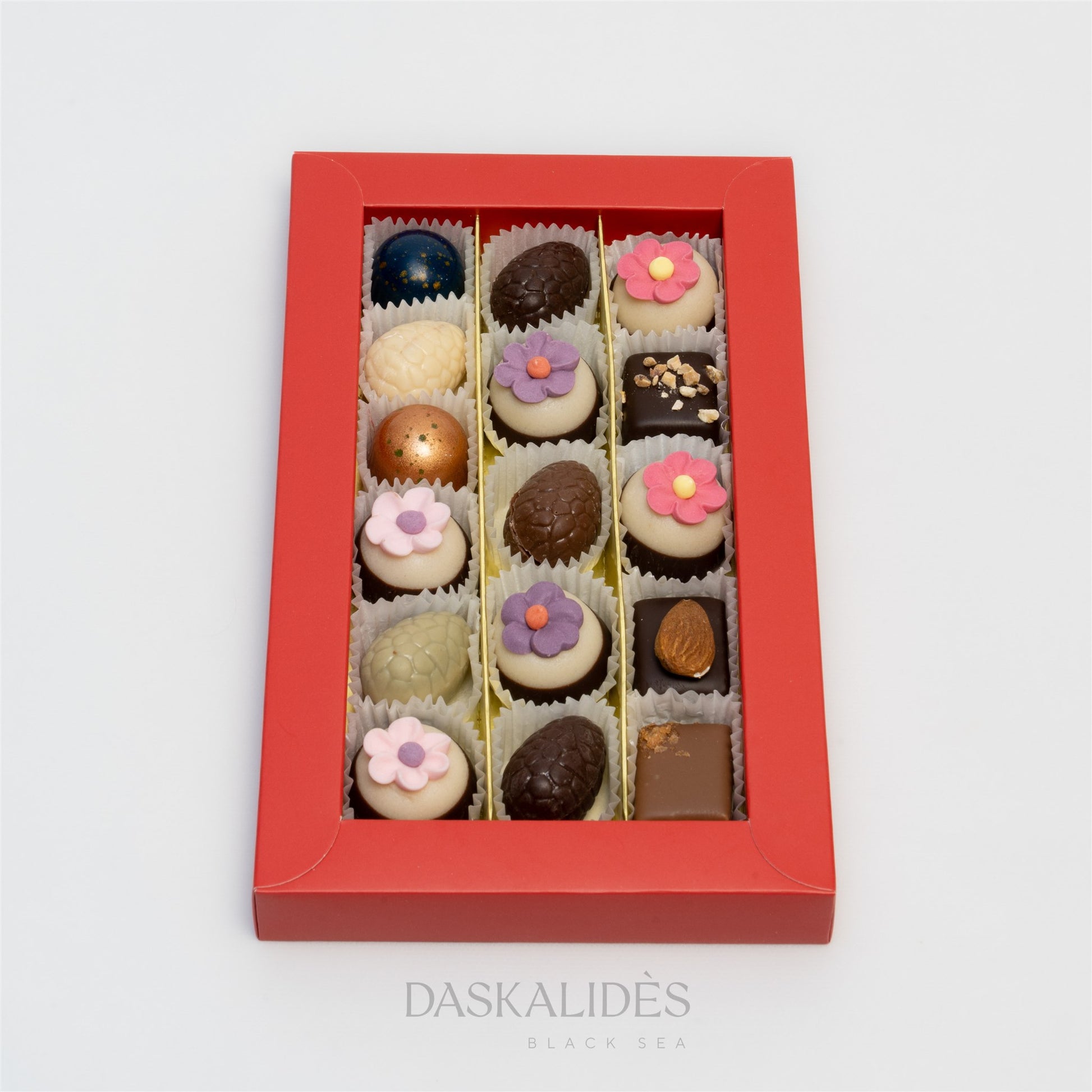 Празничната бонбониера с прозорец от Daskalidès е изискан подарък, който съчетава луксозен дизайн и богат асортимент от висококачествен белгийски шоколад. Елегантната опаковка с прозрачен прозорец разкрива селекция от ръчно декорирани шоколадови бонбони с разнообразни вкусове, текстури и шоколадови комбинации.