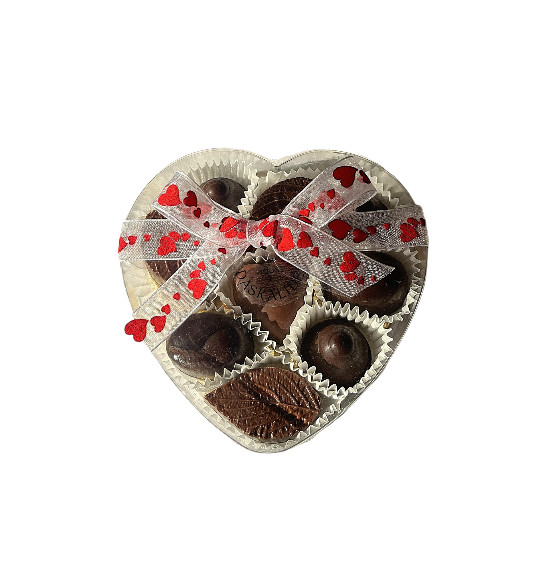 Елегантна прозрачна бонбониера във форма на сърце, съдържаща 10 изискани шоколадови бонбона Daskalidès. Фината опаковка разкрива богатото разнообразие от форми и вкусове, превръщайки я в идеален подарък за специален човек. Всеки бонбон е изработен от висококачествен белгийски шоколад и подбрани съставки, които доставят истинско удоволствие за сетивата.