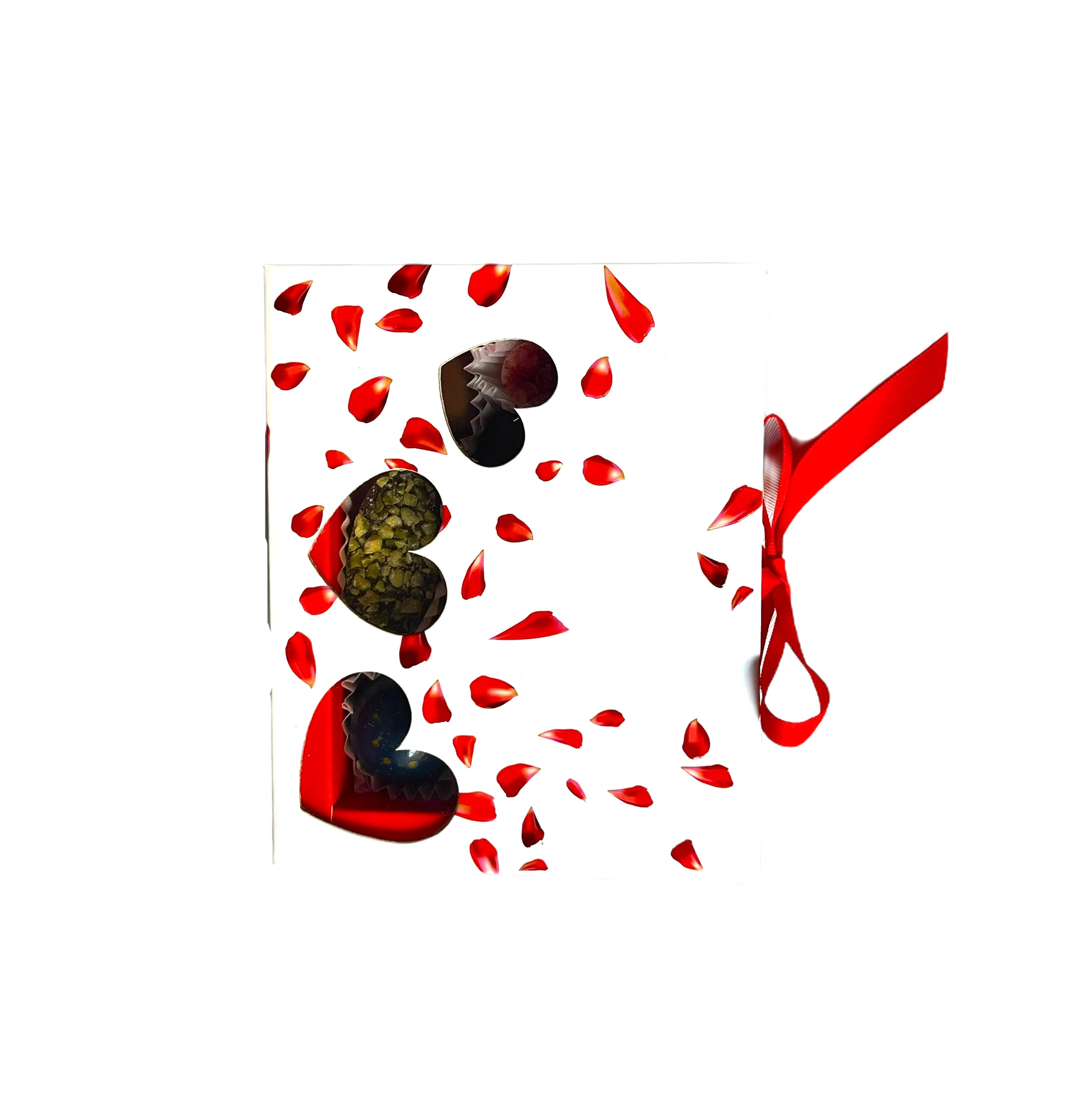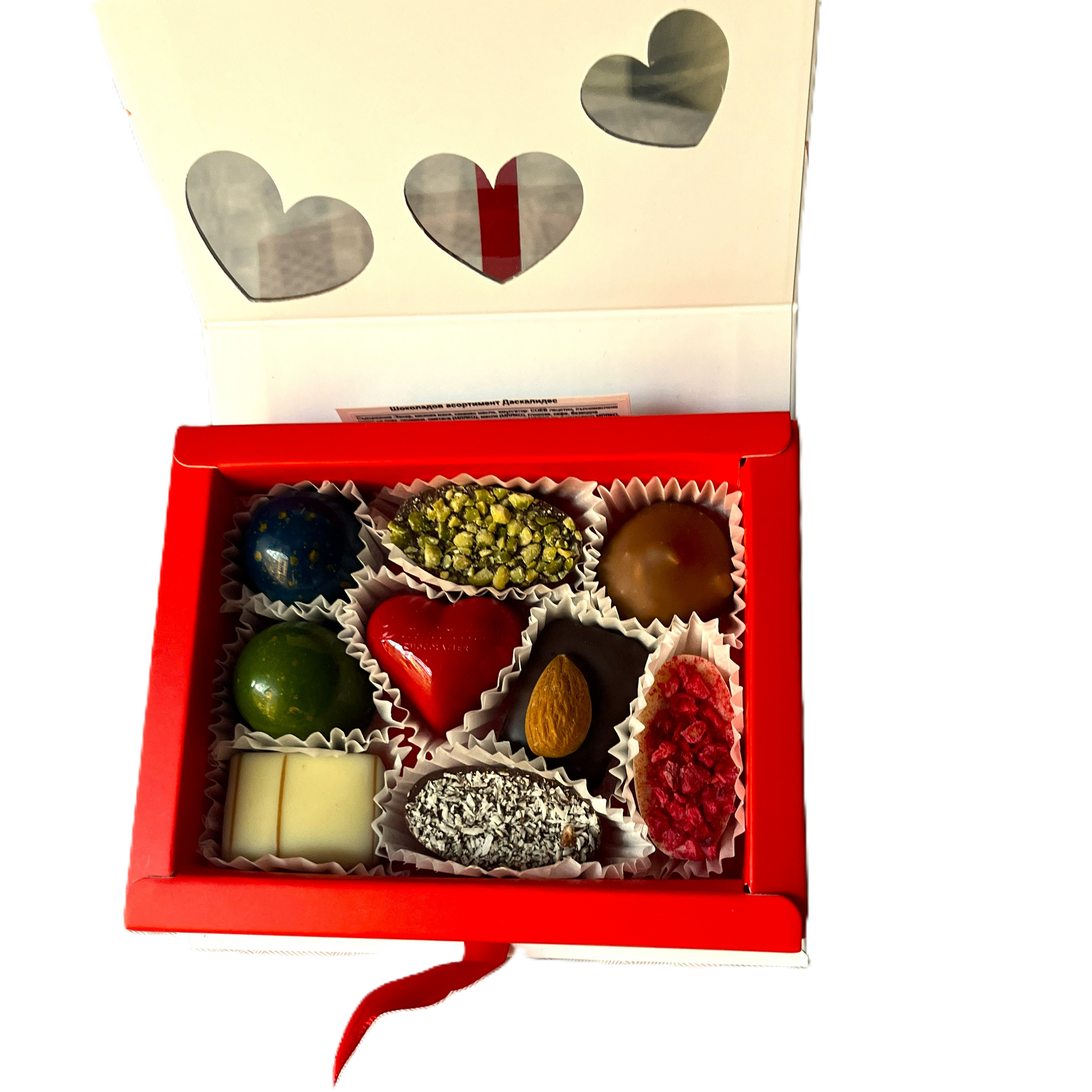 Бонбониерата със сърцевидни прозорци от Daskalidès е стилен и романтичен подарък, създаден да впечатлява още от пръв поглед. Елегантната бяла кутия е декорирана с нежни червени листенца и прозрачни отвори във формата на сърца, които разкриват селекция от изискани белгийски шоколадови бонбони.