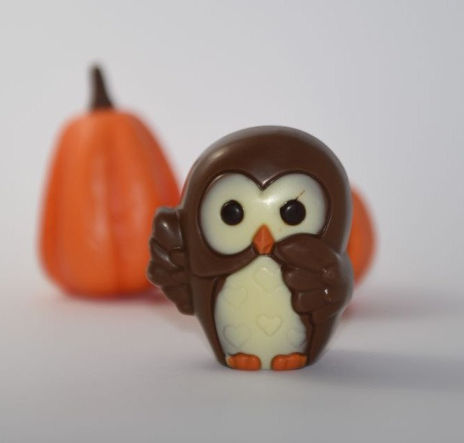 Изящна ръчно изработена шоколадова фигурка с форма на сова, изработена от фино белгийско мляко и бял шоколад. Символ на мъдрост и уют, тази шоколадова сова е неустоимо изкушение и елегантен подарък за ценители.