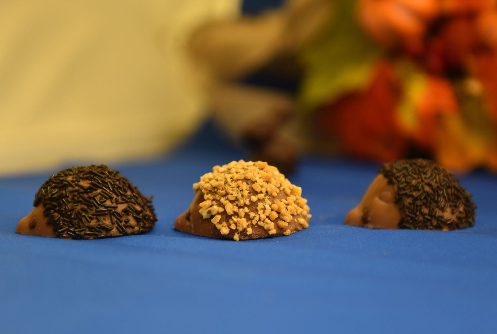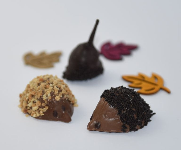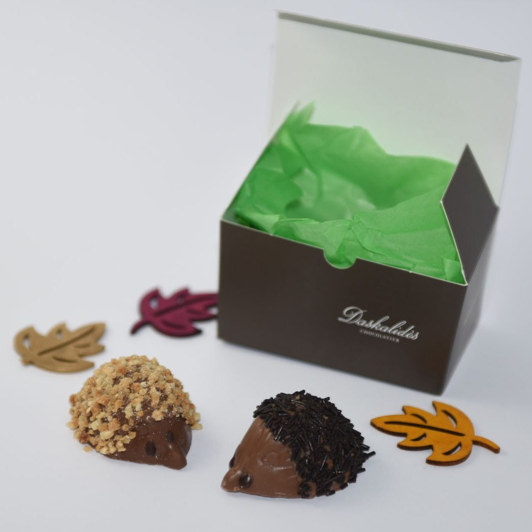 Очарователна двойка шоколадови таралежчета, покрити с фина поръска от лешникови ядки и шоколадови стърготини. Всяко таралежче е ръчно създадено от белгийски майстори и представя перфектен баланс между текстура, аромат и нежност.